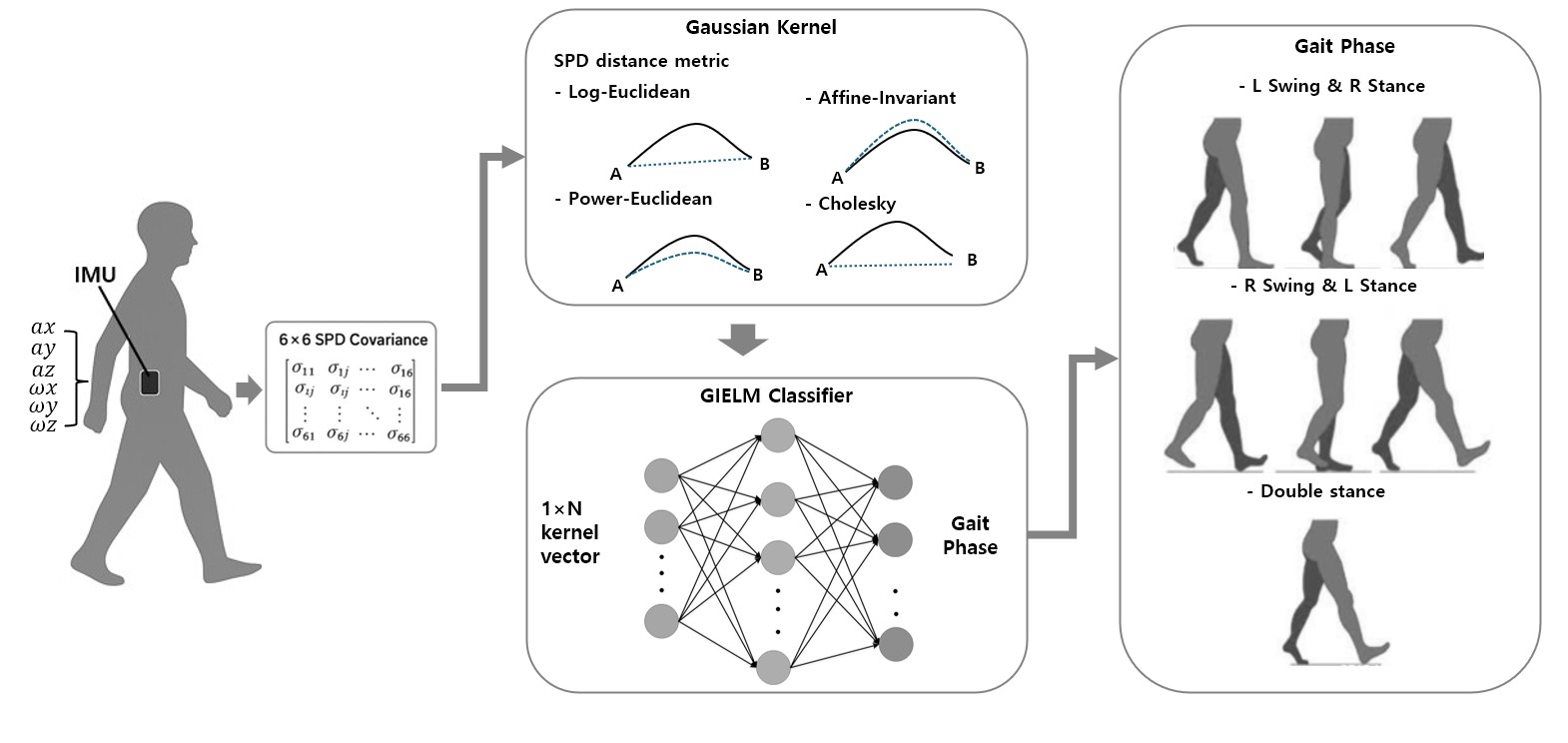 Summary The proposed framework introduces a minimal-sensor gait phase classification system that relies on a single IMU positioned at the pelvis, a location well suited to capturing bilateral locomotion dynamics while minimizing setup complexity. IMU signals are transformed into SPD covariance matrices, mapped into a nonlinear feature space through Gaussian kernels, and classified using an ELM-based model. The system identifies three functional gait states—left stance with right swing, right stance with left swing, and double stance—which are especially relevant for hemiplegic gait analysis. Validation experiments with healthy participants demonstrated high accuracy (average 89.18% with Log-Euclidean distance), confirming the feasibility of accurate gait recognition without extensive sensor arrays. These findings point toward promising applications in wearable exoskeletons and rehabilitation technologies, where simplicity, responsiveness, and user comfort are essential.