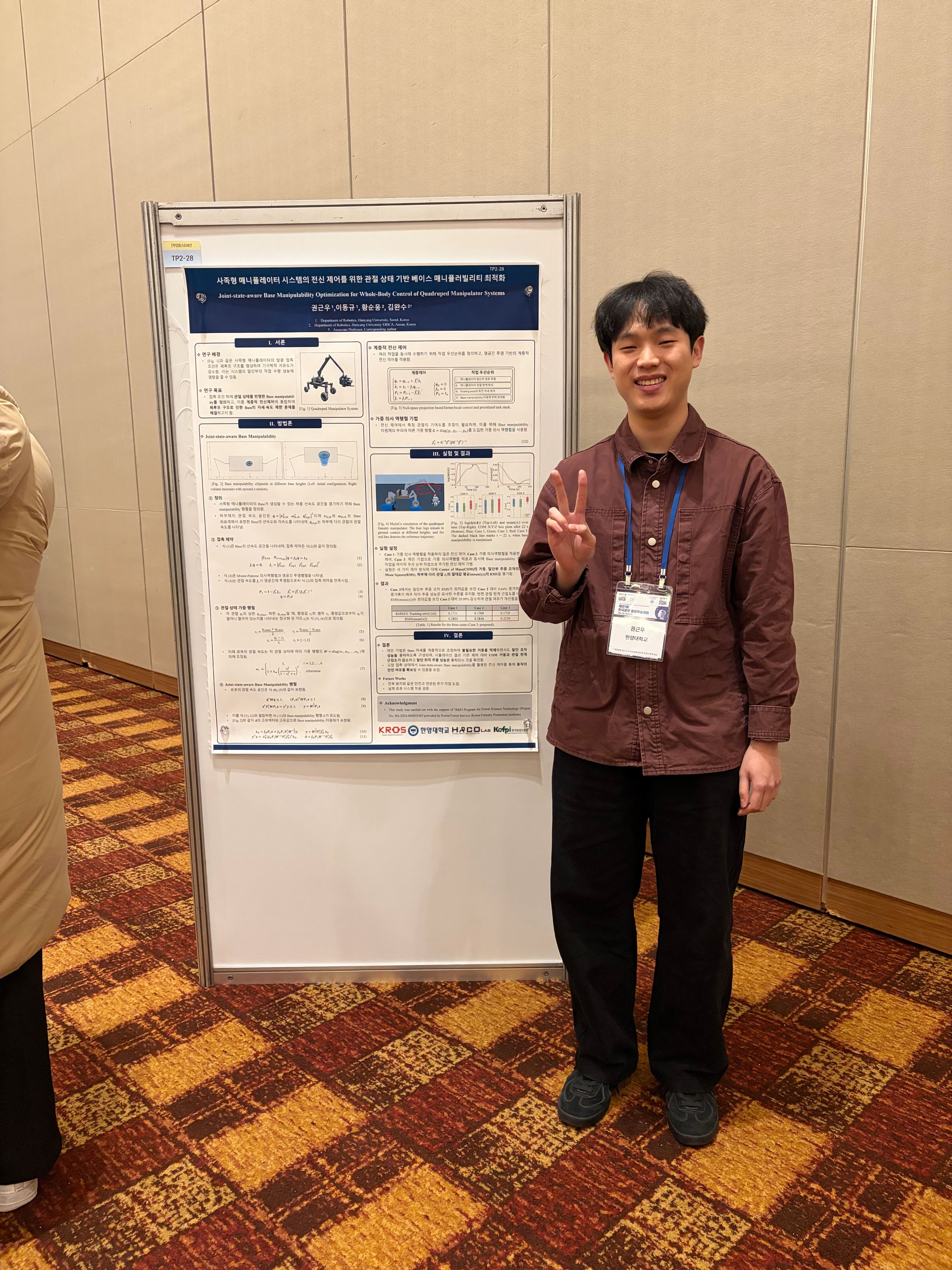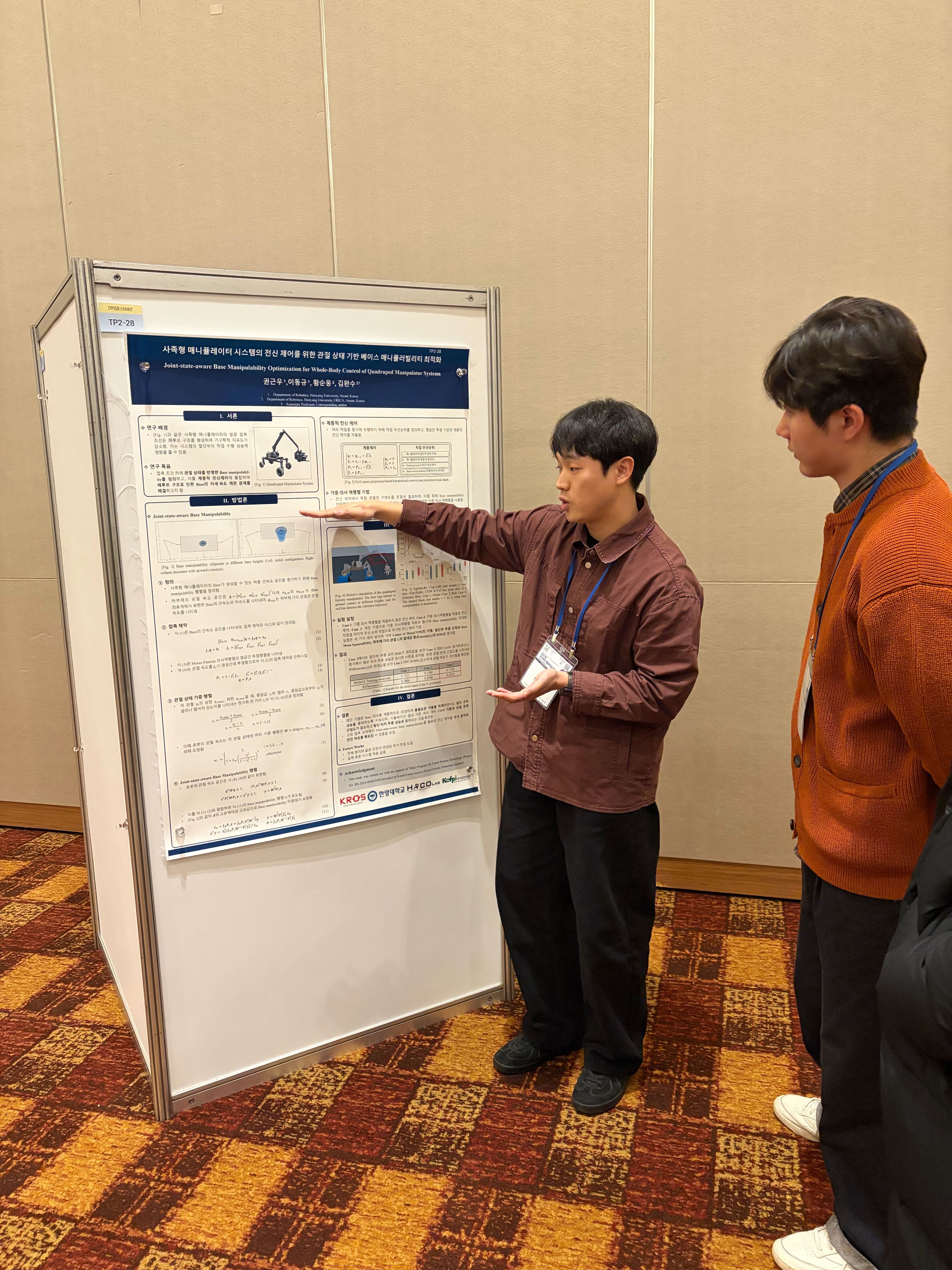 Geunwoo Kwon presented research on “Joint-state-aware Base Manipulability Optimization for Whole-body Control of Quadruped Manipulator Systems,” focusing on mobility and manipulation optimization for mobile platforms.