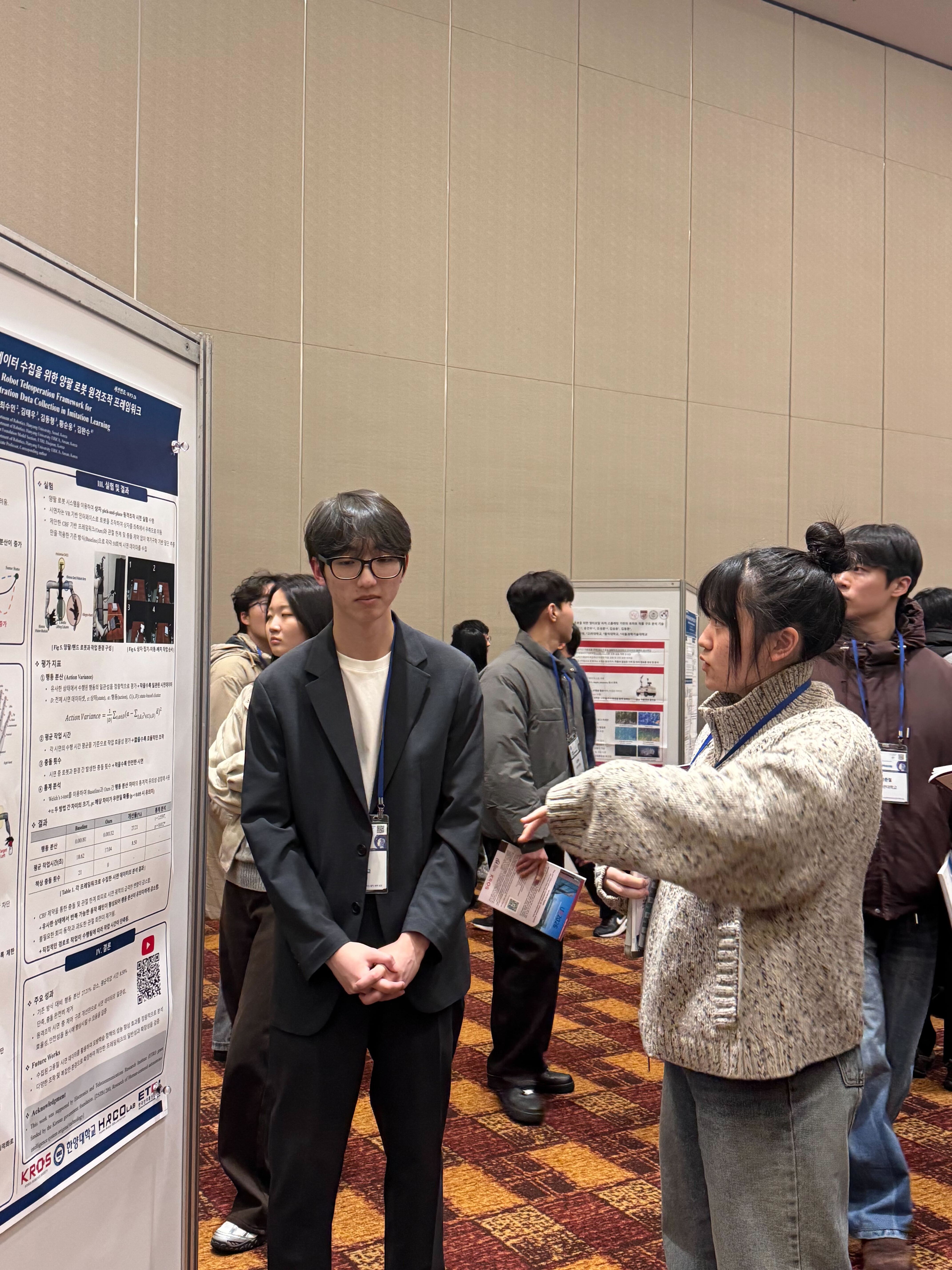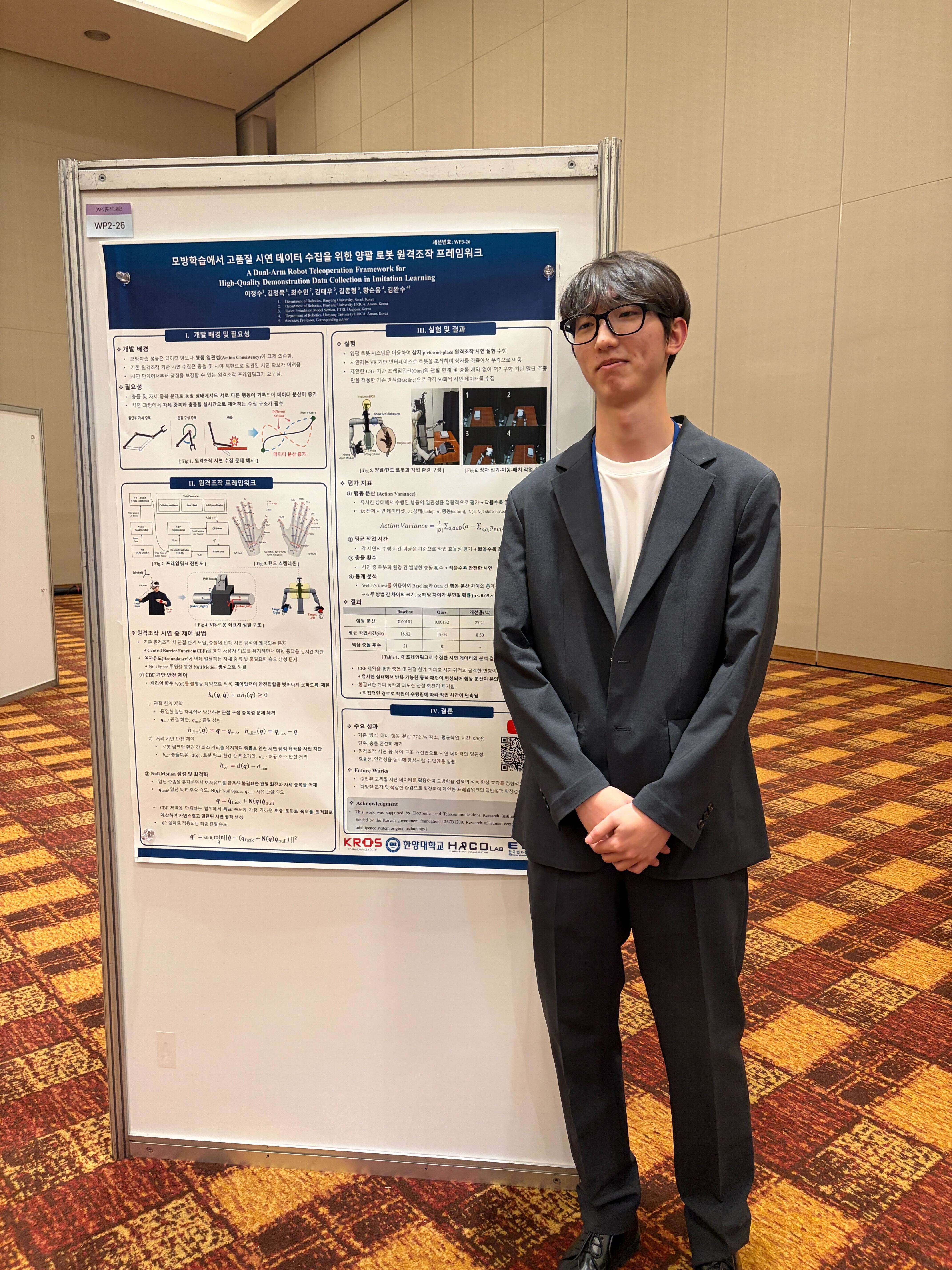 In the poster sessions, Jeongmok Kim presented “A Dual-Arm Robot Teleoperation Framework for High-Quality Demonstration Data Collection in Imitation Learning,” showcasing efficient methods for acquiring training data.