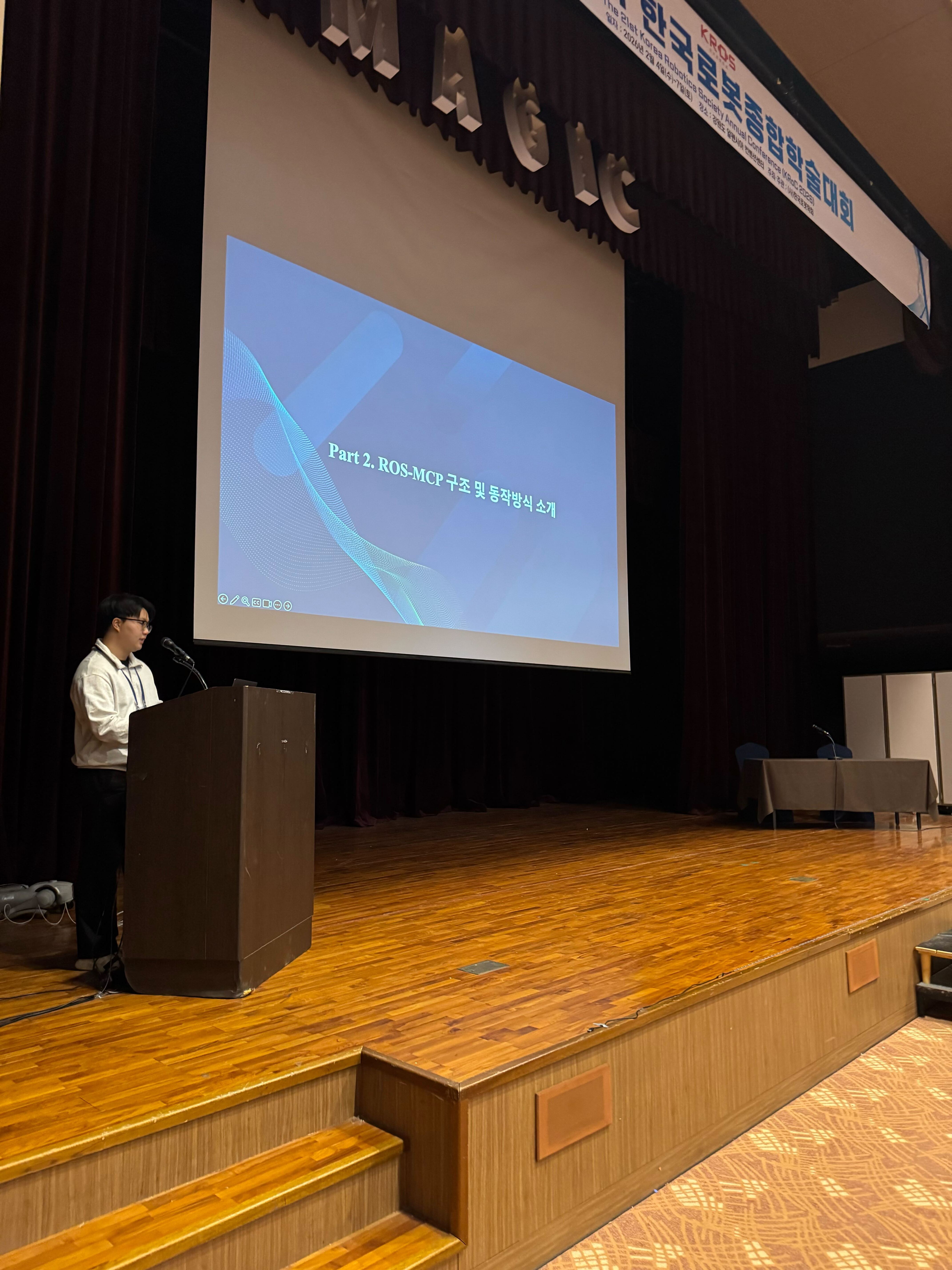 Our lab conducted a highly popular tutorial titled “ROS-MCP: Connecting LLMs with ROS Robots”. Led by Jeongsoo Lee and Jaegyun Park, the session introduced the Model Context Protocol (MCP), an open protocol designed to simplify the complex interface between Large Language Models (LLMs) and external robot systems.